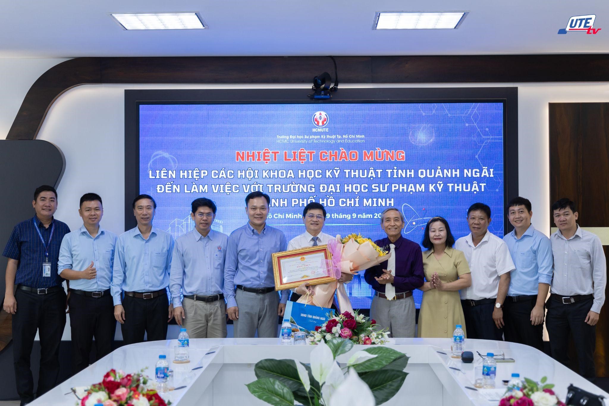 On the morning of September 29, 2025, at Meeting Room I, Ho Chi Minh City University of Technology and Education (HCMUTE) welcomed and held a working session with the delegation from the Union of Science and Technology Associations of Quang Ngai Province. The meeting aimed to strengthen cooperative relations and acknowledge HCMUTE’s contributions to Quang Ngai Province over the years, particularly in promoting science and technology activities as well as creativity movements among high school students. On this occasion, the Union presented a Certificate of Merit from the People’s Committee of Quang Ngai Province to Assoc. Prof. Dr. Le Hieu Giang – President of HCMUTE, for his outstanding achievements in co-organizing the 3rd Quang Ngai Robot Innovation Contest 2025.