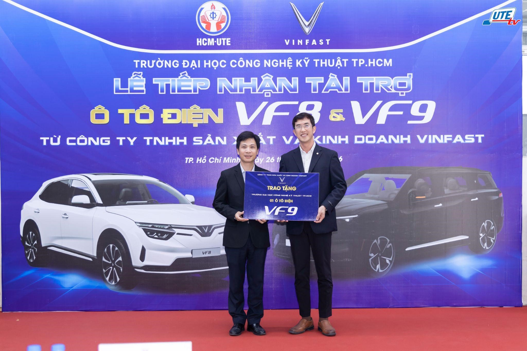 HCM-UTE representatives receiving the donation board from VinFast