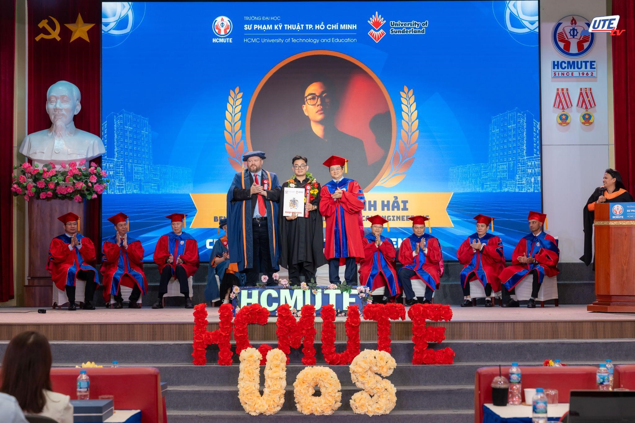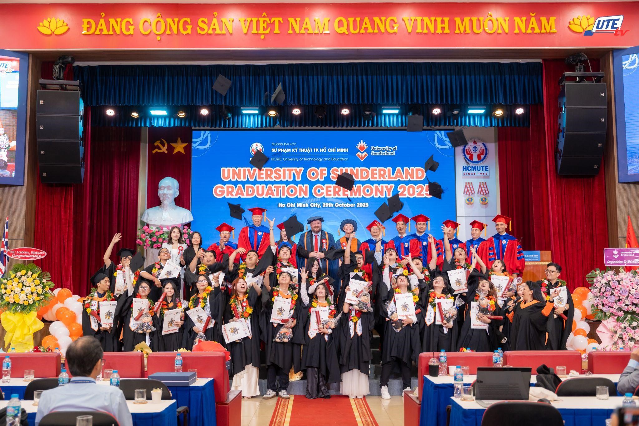 The Graduation Ceremony for the joint training program between HCMUTE and the University of Sunderland concluded in a solemn and heartfelt atmosphere. The memorable moment when 28 graduates tossed their caps marked the end of a journey of perseverance, growth, and pride. This milestone not only celebrates academic achievement but also opens a new chapter, where graduates confidently enter the global environment as proactive, resilient global citizens ready to contribute to the community.