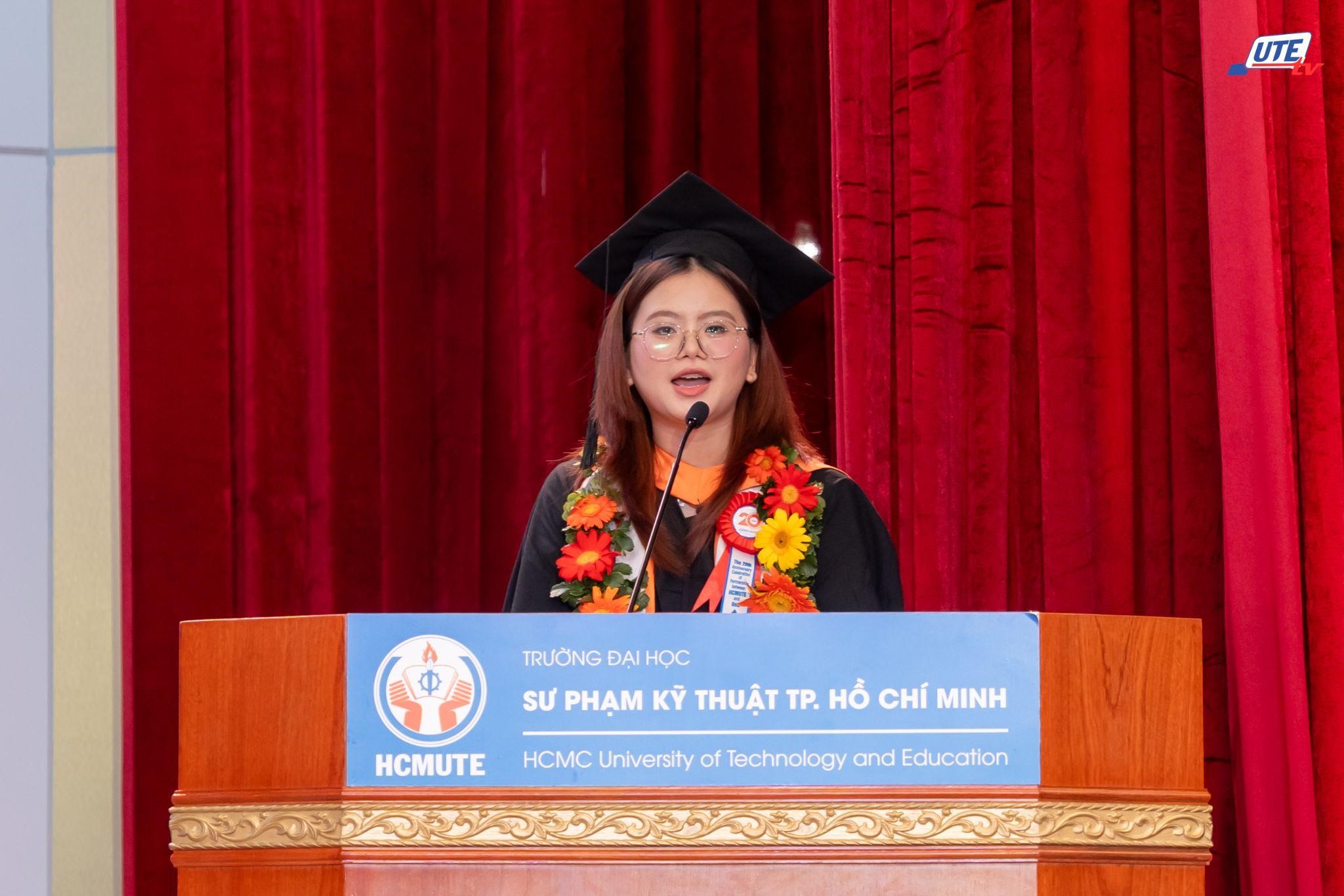 Representing the graduates, new Bachelor Nguyen Nhat Thao Quyen expressed heartfelt gratitude to HCMUTE’s leadership, professors from the University of Sunderland and TMC Academy, and the Faculty of International Education at HCMUTE for their dedication and support throughout the program. She shared that today’s achievement reflects continuous effort and guidance from teachers, and marks the beginning of a new journey where each graduate brings knowledge and ambition to contribute to the community and society.