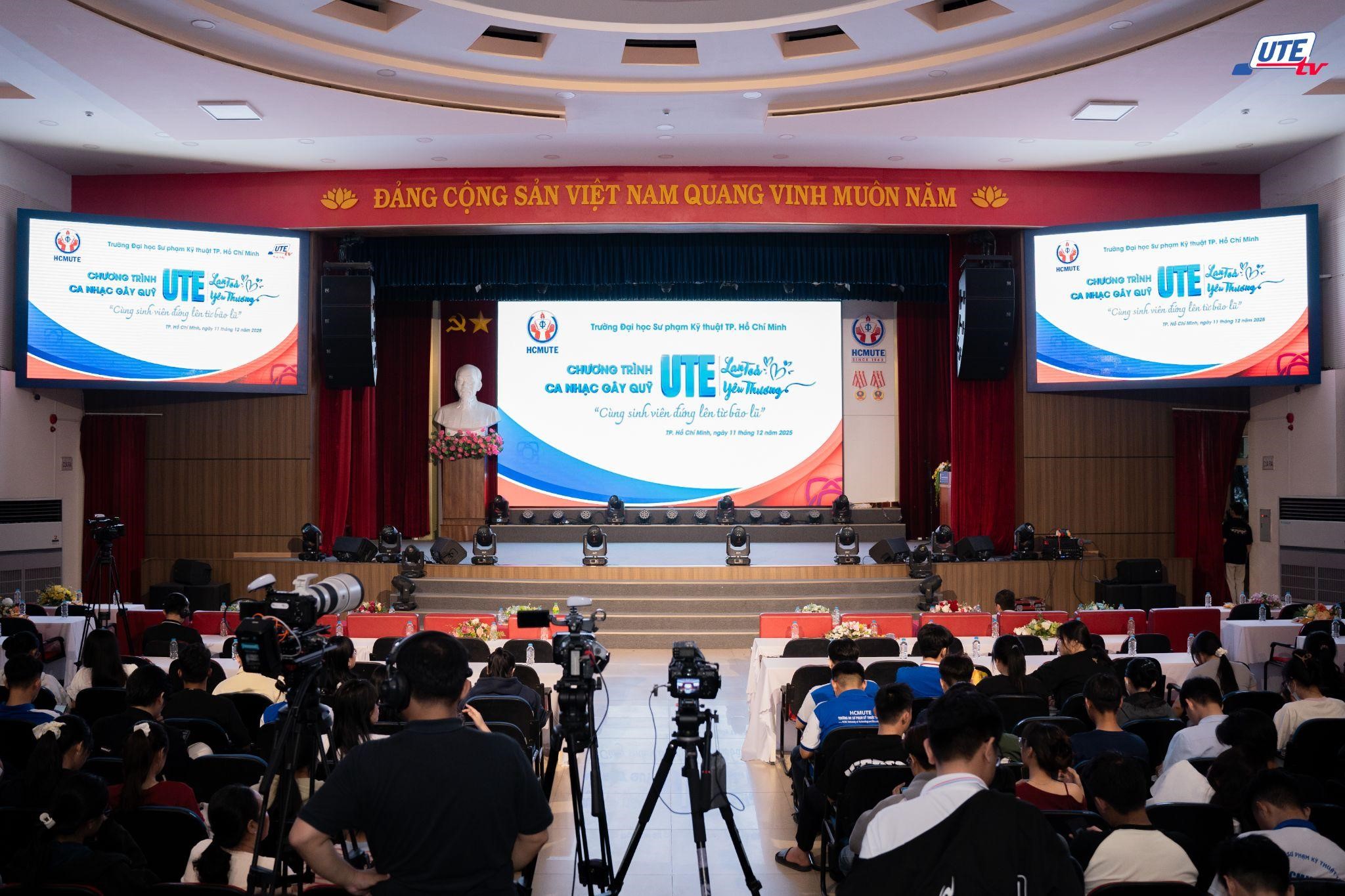 On the evening of December 11, 2025, at the Grand Hall of Area A, Ho Chi Minh City University of Technology and Education (HCMUTE) organized a charity fundraising music night entitled “HCMUTE Spreading Love – Accompanying Students After the Floods.” The event brought together a large number of artists, benefactors, members of the retired faculty community, alumni, staff, employees, and students of the University. Through the program, a total of VND 376,918,062 was raised to support students and high school pupils whose families suffered especially severe losses during the historic floods in Central Vietnam in 2025.