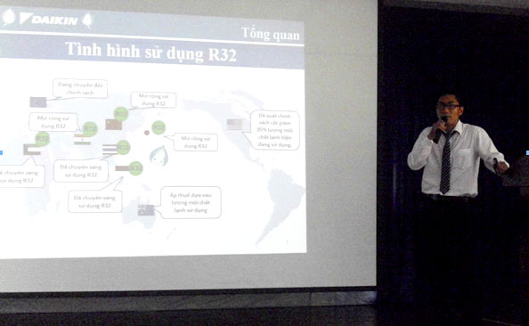 Mr. Nguyen Thanh Luan is introducing the new refrigerant in air conditioning system.
